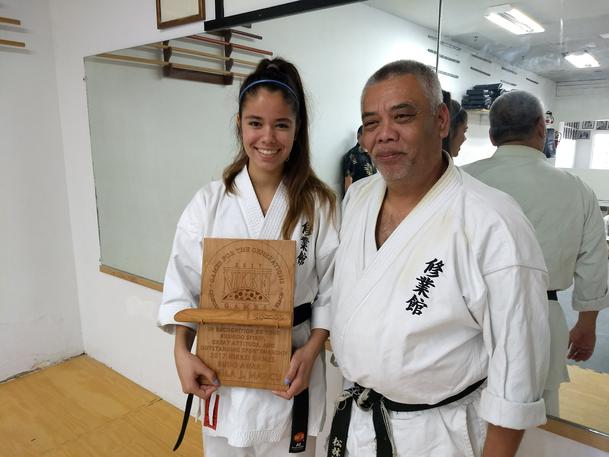 Yamila Marcu trains at the Shugyokan Dojo in Gardena under Sensei Prince Loeffler. She has been a consistent competitor that always is willing to assist others. The amazing thing is she is 14 years old and has the skill and maturity of a much older karateka. She frequently medals in WKF and USNKF competitions and at the dojo loves sharing her karate experiences by helping her younger team mates giving them private help and encouragement. She is a prime example of a true karateka displaying not only excellent skill but humility as well, giving back to the art of karate through her teaching.